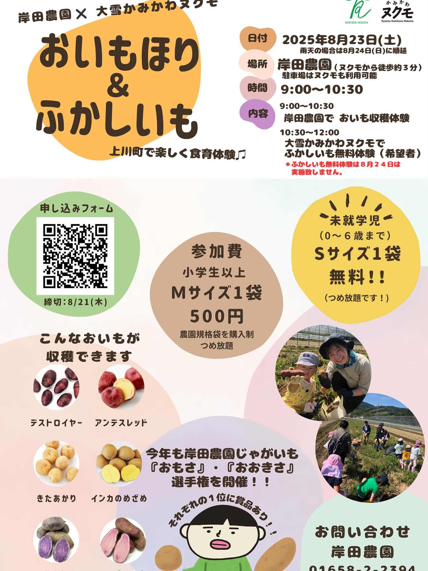 ヌクモとのコラボ企画!!6種のいもほり体験を2年にぶり開催します! 更新日:2026年1月23日 公開日:2025年8月14日 お知らせその他野菜農業体験 北海道でのリアルな農業をお伝えします→@kishidanouen 北海道、岸田農園です 2年ぶりにやります(去年は雨で中止) 岸田農園、6種のカラフルじゃがいも堀り体験 このイベント なんと 未就学児は『無料』でSサイズ […] 続きを読む